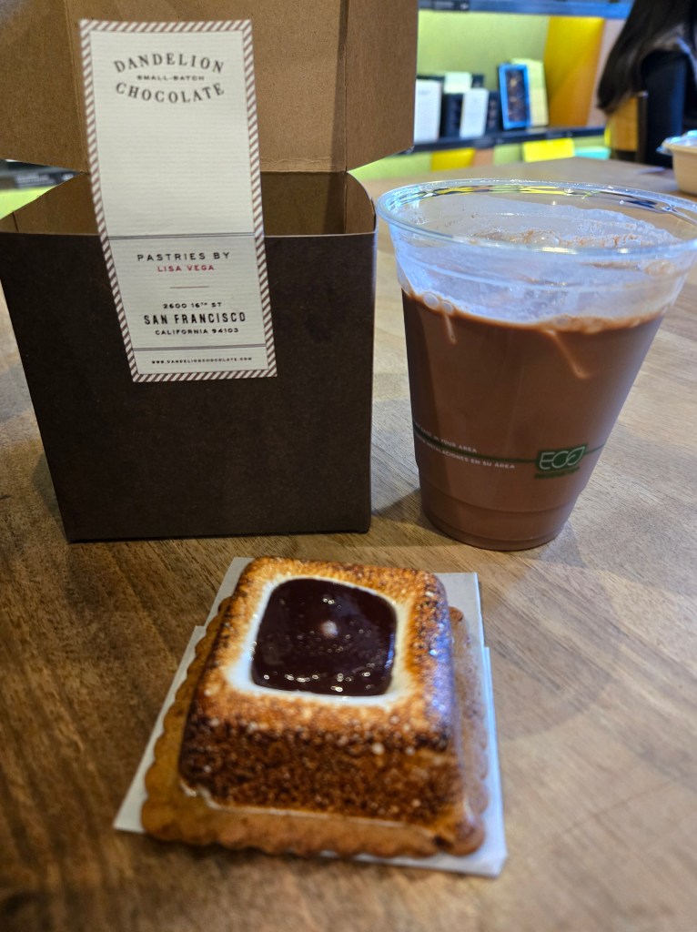 • The tourism highlight reel continued with a cable car trip back downtown and then on to BART and the Mission for some sister-day shopping, a super quesadilla (that was how it was presented on-menu); and a Dandelion Chocolate s’more… Robbie was most pleased